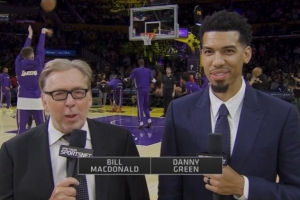 體育資訊10月13日訊 今日前NBA球員、現(xiàn)湖人電臺(tái)Spectrum SportsNet解說員丹尼-格林現(xiàn)場解說湖人VS勇士的季前賽。