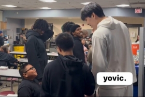 語(yǔ)言隔閡擋不住的熱情!小楊現(xiàn)身開(kāi)拓者社區(qū)活動(dòng)與小球迷親密互動(dòng)