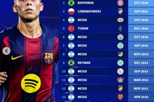 據(jù)統(tǒng)計(jì),巴薩球員在歐冠歷史上共計(jì)16次上演帽子戲法,具體如下: