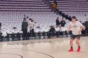 萬眾期待!楊瀚森身穿中國紅戰(zhàn)靴迎接常規(guī)賽首秀 賽前投籃熱身