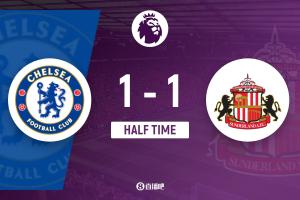 上半場(chǎng)傷停補(bǔ)時(shí)3分鐘,半場(chǎng)結(jié)束,切爾西暫1-1桑德蘭。