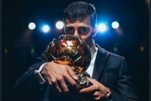 曼城官推曬羅德里親吻金球獎照片:去年今日,羅德里獲得金球獎