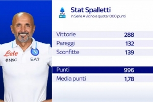 數(shù)據(jù)統(tǒng)計顯示,斯帕萊蒂共計在意甲取得288勝、132平、139負,總積分996分、場均積分1.78分。