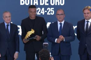 體育資訊10月31日訊 官方消息,姆巴佩在伯納烏球場貴賓室領(lǐng)取上賽季的歐洲金靴獎(jiǎng)杯。