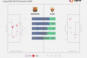 據(jù)OptaJose的數(shù)據(jù)統(tǒng)計,埃爾切是自2005-06賽季以來,首支在西甲聯(lián)賽中對陣巴薩時,控球率高于對手的升班馬球隊。