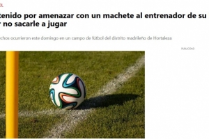 據馬德里高級警察總局通報,事件發(fā)生在本周日,位于馬德里奧爾塔萊薩區(qū)的一處足球場附近。被捕者與其兒子的足球教練發(fā)生激烈爭吵,多名目擊者向警方證實該男子曾手持砍刀作出暴力姿態(tài)。