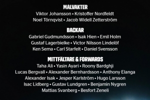 中前場(chǎng):塔哈-阿里(馬爾默)、阿亞里(布萊頓)、巴德吉(巴薩)、貝里瓦爾(熱刺)、伯恩哈德森(荷爾斯泰因基爾)、伊蘭加(紐卡)、伊薩克(利物浦)、卡爾斯特羅姆(烏迪內(nèi)斯)、雨果-拉爾森(法蘭克福)、利德伯格(達(dá)姆施塔特)、倫德格倫(加爾斯)、本杰明-尼格倫(凱爾特人)、斯萬(wàn)伯格(沃爾夫斯堡)、澤尼利(埃弗斯堡)