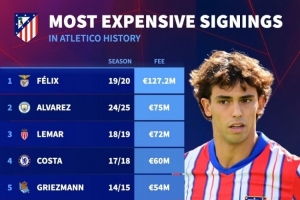 體育資訊11月12日訊 阿波羅體育資本斥資13億歐元收購馬競俱樂部55%股份,并承諾未來幾年再投資約13億歐元,德國轉(zhuǎn)會市場統(tǒng)計了馬競隊史引援的費(fèi)用,并列出最貴引援排名。