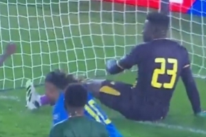 第91分鐘,民主剛果由后衛(wèi)姆貝巴在角球中攻破球門,奧納納伸腳但是沒能擋住皮球打進(jìn)近角,被進(jìn)球后癱坐在地↓