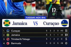 5輪過(guò)后,庫(kù)拉索11分小組第一,領(lǐng)先小組第二牙買加1分,下輪兩隊(duì)將直接交手,庫(kù)拉索不敗即直通世界杯,比賽于北京時(shí)間11月19日9點(diǎn)在牙買加主場(chǎng)進(jìn)行。兩隊(duì)首回合交手,庫(kù)拉索主場(chǎng)2-0擊敗牙買加。
