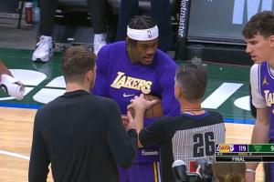體育資訊11月16日訊 在今日湖人戰(zhàn)勝雄鹿的賽后,雙方球員以及裁判針對(duì)比賽用球展開(kāi)了一段拉扯。