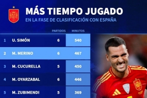 體育資訊11月19日訊 德國(guó)轉(zhuǎn)會(huì)市場(chǎng)統(tǒng)計(jì)了西班牙球員本屆世預(yù)賽的出場(chǎng)時(shí)間,并列出榜單,門(mén)將西蒙540分鐘居首,梅里諾467分鐘非門(mén)將球員中最多。