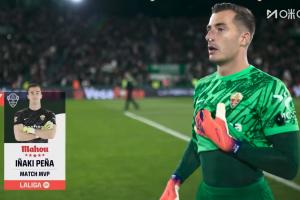 完成5次撲救!官方:埃爾切門將佩尼亞當(dāng)選全場最佳球員