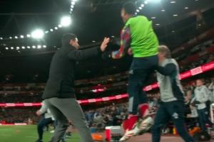當(dāng)埃澤第76分鐘破門,上演帽子戲法幫助阿森納4-1領(lǐng)先熱刺時,原本在熱身的斯凱利沖向教練席高高躍起振臂歡呼,隨后他和阿爾特塔為首的教練組相擁慶祝,替補席上的多名隊員隨后也加入慶祝。
