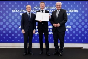 在伯納烏榮譽包廂舉行的儀式上,克羅斯被授予德國功績勛章騎士十字勛章。德國總統(tǒng)施泰因邁爾親自為這位皇馬傳奇和世界足壇巨星頒發(fā)了這一榮譽。出席授勛儀式的還有皇馬名譽主席何塞·馬丁內斯·皮里、機構關系總監(jiān)布特拉格諾、主帥阿隆索、球員巴爾韋德、呂迪格,以及皇馬傳奇球員羅伯托·卡洛斯、阿韋羅亞和索拉里。