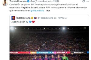 而阿斯報副主編,也是知名皇馬球迷的龍賽羅在社媒轉(zhuǎn)發(fā)了巴薩官方的這則動態(tài),并表示:“當事人自己招供了,終于承認了內(nèi)格雷拉丑聞那令人臉紅的事實。希望皇馬把這事寫進即將發(fā)給FIFA的那份“毀滅性報告”里面。呵呵。”