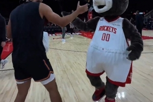 人緣還是很棒的!狄龍賽前和火箭主場(chǎng)的吉祥物熊嬉戲打鬧