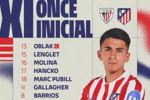 馬競首發(fā):13-奧布拉克、15-朗格萊、16-莫利納、17-漢茨科、18-普比爾、4-加拉格爾、8-巴勃羅·巴里奧斯、20-朱利亞諾·西蒙尼、23-尼古拉斯·岡薩雷斯、11-阿爾馬達(dá)、19-阿爾瓦雷斯
