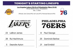 體育資訊12月8日訊 今日8點(diǎn)半,76人主場對陣湖人。賽前雙方公布了本場首發(fā)陣容: