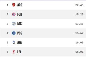 體育資訊12月11日訊 歐冠結束聯(lián)賽階段前6輪的爭奪,數(shù)據機構Opta預測了歐冠聯(lián)賽階段的最終排名。