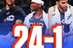 雷霆49分擊潰太陽,隊(duì)史最高16連勝,24勝1負(fù)開局——輸?shù)哪菆鍪潜晨勘?,亞歷山大帶哈騰和三替補(bǔ)。