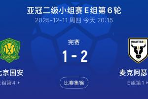 體育資訊12月11日訊 亞冠二級小組賽E組第6輪,北京國安1-2輸給麥克阿瑟FC,本輪中超球隊亞冠賽場表現(xiàn),海港、蓉城戰(zhàn)平,國安、申花失利。