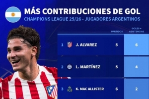 體育資訊12月12日訊 德國轉(zhuǎn)會市場統(tǒng)計了本賽季阿根廷球員在歐冠的參與進球數(shù)量,并列出榜單。