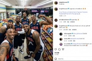 其中一張照片是美國隊巨星在一家超市里的合照、另一張是霍華德與奧拉朱旺、尤因、大衛(wèi)·羅賓遜在香港和合照?;羧A德配文:“傳奇再現(xiàn),經(jīng)典瞬間!”
