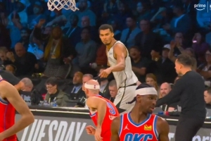 你防不住我!文班面對(duì)卡魯索打進(jìn)中距離 然后手指著對(duì)手振振有詞