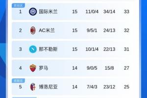 目前積分榜上,國米33分領跑,米蘭32分第二,那不勒斯31分第三。