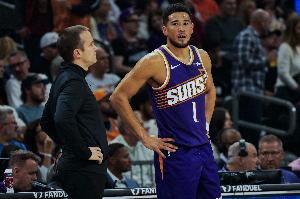 上半場比賽,復(fù)出的布克進(jìn)攻端投籃手感還需要調(diào)整,罰球也丟了兩個,他出戰(zhàn)13分鐘,7中4,三分2中0,罰球4中2拿到10分1籃板2助攻1搶斷,正負(fù)值-6。