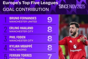據(jù)Squawka統(tǒng)計(jì),B費(fèi)今年11月以來9場(chǎng)英超比賽參與9粒進(jìn)球,五大聯(lián)賽同期參與進(jìn)球最多。