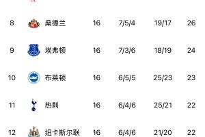 英超第16輪戰(zhàn)罷,前三強與后面的球隊拉開分差。英超從第5(水晶宮)到第15(布倫特福德)之間,僅相差6分。其中第5水晶宮、第6曼聯(lián)、第7利物浦、第8桑德蘭同積26分。