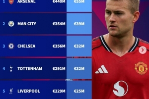 體育資訊12月16日訊 德轉(zhuǎn)盤點(diǎn)了英超Big6球隊(duì)防線平均身價(jià)榜(不包括門將),其中阿森納高居榜首,具體如下(防線總身價(jià)+平均身價(jià)):