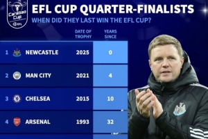 體育資訊12月16日訊 英格蘭聯(lián)賽杯八強(qiáng)戰(zhàn)即將開戰(zhàn),《轉(zhuǎn)會(huì)市場(chǎng)》也統(tǒng)計(jì)了八強(qiáng)球隊(duì)上次在聯(lián)賽杯奪冠距今的時(shí)間。