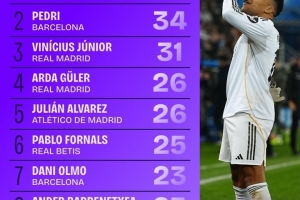 體育資訊12月17日訊 西甲運(yùn)動(dòng)戰(zhàn)創(chuàng)造機(jī)會(huì)排行榜出爐,姆巴佩47次高居第一,佩德里、維尼修斯緊隨其后。