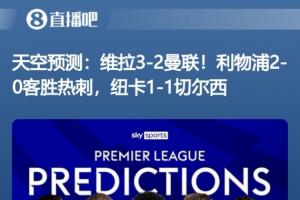 >>天空預(yù)測:維拉3-2曼聯(lián)!利物浦2-0客勝熱刺,紐卡1-1切爾西目前英超本輪10場比" />