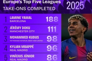 體育資訊12月31日訊 2025年即將結(jié)束,squawka也統(tǒng)計了本年度成功過人情況,亞馬爾斷崖領跑。