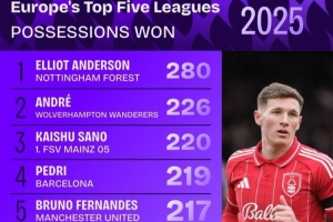 體育資訊12月31日訊 2025年即將結(jié)束,數(shù)據(jù)機(jī)構(gòu)squawka也統(tǒng)計(jì)了本年度五大聯(lián)賽奪回球權(quán)情況,諾丁漢森林中場埃利奧特·安德森獨(dú)自領(lǐng)跑。