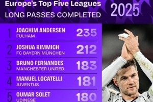 體育資訊1月1日訊 2025年已經(jīng)結(jié)束,數(shù)據(jù)機(jī)構(gòu)squawka也統(tǒng)計了2025年成功長傳情況,富勒姆的后衛(wèi)安諾森領(lǐng)跑。