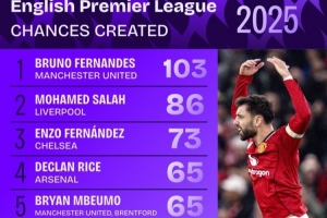 體育資訊1月1日訊 Squawka統(tǒng)計(jì)2025年英超球員創(chuàng)造機(jī)會(huì)榜,B費(fèi)103次居首,薩拉赫第二,恩佐第三。