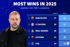 2025五大聯(lián)賽勝場榜:巴薩31勝居首,拜仁皇馬各27勝、羅馬26勝