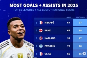 體育資訊1月2日訊 2025年已經(jīng)過去,《轉(zhuǎn)會市場》也統(tǒng)計(jì)了2025前15聯(lián)賽球員的俱樂部+國家隊(duì)各項(xiàng)賽事總參與進(jìn)球情況,皇馬前鋒姆巴佩領(lǐng)跑。