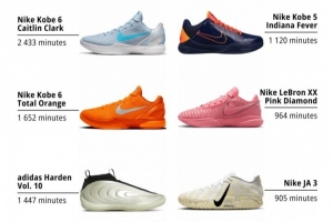 排名第一的是凱特琳·克拉克的PE配色Kobe 6 Protro,上腳時(shí)長(zhǎng)為2433分鐘;