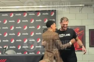 小吧直擊開拓者賽前發(fā)布會(huì)!斯普利特與丹尼·格林老友相見抱一抱