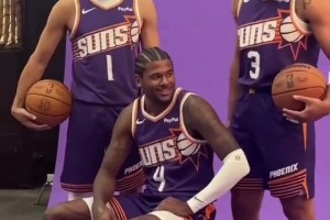 小子挺有地位??!杰倫-格林坐在C位 布克和狄龍分列左右