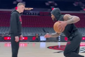 這狀態(tài)看起來(lái)很不錯(cuò)??!利拉德已經(jīng)開始訓(xùn)練急停&后撤步三分~