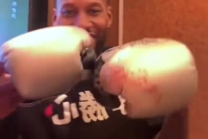 威姆斯贏下和惡鼠的八角籠戰(zhàn)之后 直播間展示拳擊手套上的番茄醬