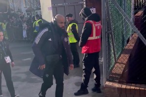 與水晶宮賽前,姆伯莫被球迷拍到,是最后一個(gè)下車(chē)的