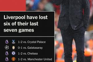 利物浦各項(xiàng)賽事近7場(chǎng)6敗,聯(lián)賽杯出局、止步16強(qiáng),英超落后榜首7分。上賽季的耐考王如今節(jié)節(jié)退敗。